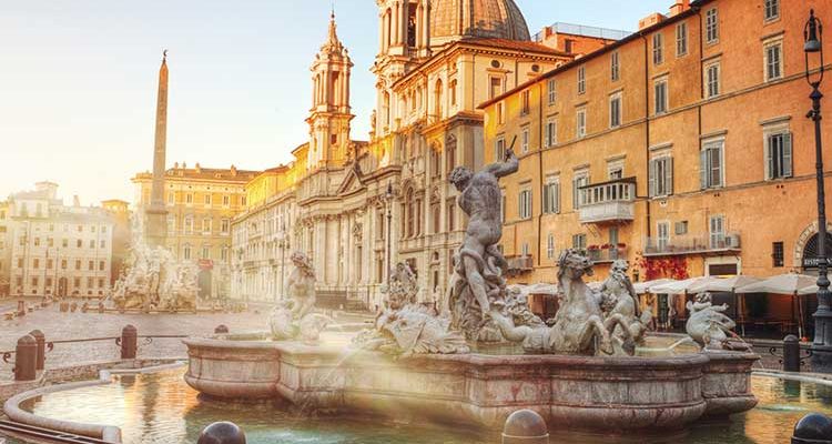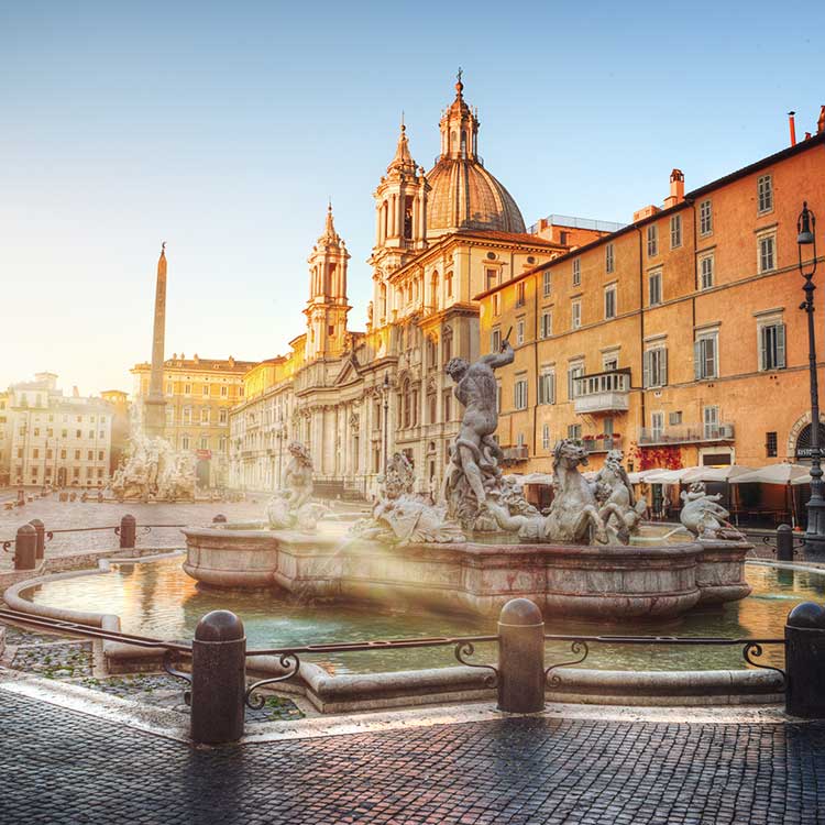 I luoghi più caratteristici della città eterna sono le incantevoli piazze: Campo dei Fiori, con al centro la statua del filosofo eretico Giordano Bruno; Piazza Navona, dove sorge la splendida Fontana dei Quattro Fiumi del Bernini; Piazza di Spagna dominata dalla celebre scalinata Trinità dei Monti; Piazza del Popolo con le caratteristiche chiese gemelle; Piazza Venezia con l’imponente Vittoriano alle cui spalle sorge il Campidoglio; il Largo di Torre argentina con i resti di antichi templi romani; Piazza Trilussa e Piazza Santa Maria in Trastevere, site entrambe nello storico quartiere di Trastevere.